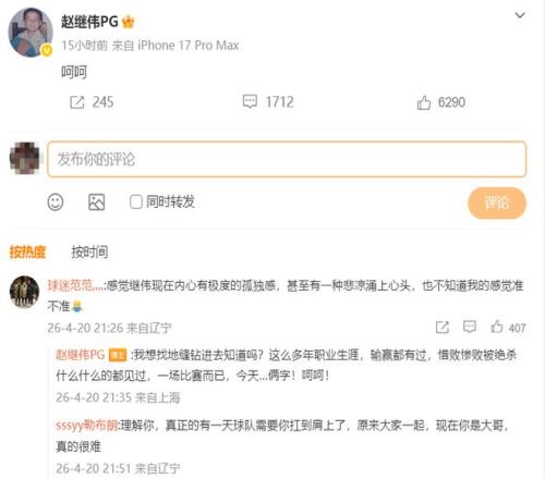 “呵呵?!壁w繼偉寫道,隨后他又在評論區(qū)繼續(xù)表示,“我想找地縫鉆進去知道嗎?這么多年職業(yè)生涯,輸贏都有過,惜敗慘敗被絕殺什么什么的都見過,一場比賽而已,今天…倆字!呵呵!”