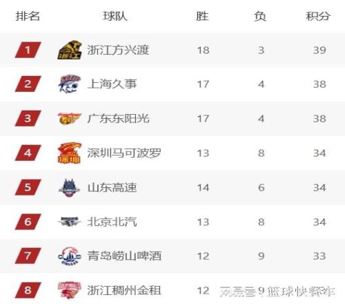 排在積分榜第5名的是山東隊(duì),他們的戰(zhàn)績?yōu)?4勝6負(fù),不過,由于少賽一輪的緣故,山東隊(duì)在排名上稍微吃虧,目前只能暫居積分榜第5名。而北京隊(duì)則緊隨其后,排在積分榜第6名,他們的戰(zhàn)績?yōu)?3勝8負(fù),與深圳隊(duì)一樣。積分榜第7名則是青島隊(duì),他們的戰(zhàn)績?yōu)?2勝9負(fù),浙江隊(duì)與青島隊(duì)一樣,也是12勝9負(fù),他們則排在積分榜第8名。目前,積分榜第4-8名的球隊(duì),他們之間的差距非常小,任何的一場勝負(fù),都會影響到多支球隊(duì)的排名。