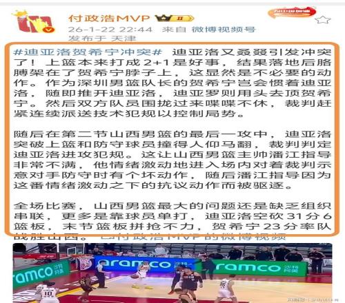 “隨后在第二節(jié)山西男籃的最后一攻中,迪亞洛突破上籃和防守球員撞得人仰馬翻,裁判判定迪亞洛進(jìn)攻犯規(guī)。這讓山西男籃主帥潘江指導(dǎo)非常不滿,他情緒激動地進(jìn)入場內(nèi)對著裁判示意對手防守時有個壞動作,隨后潘江指導(dǎo)因?yàn)檫@番情緒激動之下的抗議動作而被驅(qū)逐?!?。