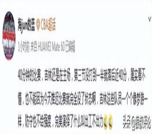 媒體人“海jun的藍”發(fā)文點評:40分鐘的比賽,吉林還是在主場,第三節(jié)沒打到一半就落后近40分,屬實看不懂,也不能因為今天推遲比賽就完全沒了狀態(tài)啊,吉林這些隊員一個個像夢游一樣,防守也不給強度,完美演繹了什么叫出工不出力。