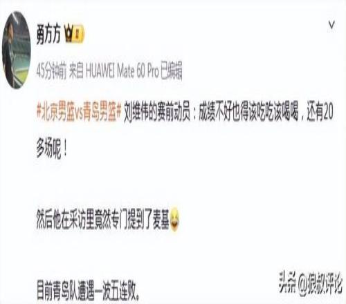 賽前,劉維偉動員球員表示:“成績不好也得該吃吃該喝喝,還有20多場呢!”。