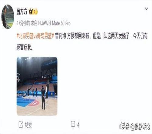 根據(jù)媒體人勇方方報道,曾凡博、方碩都回來參加了踩場訓(xùn)練,但是翟曉川這兩天發(fā)燒了,今天仍有感冒癥狀。