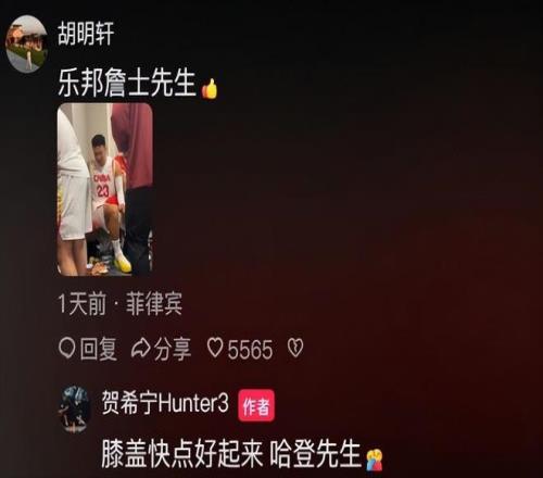 最近賀希寧在社媒與胡明軒互動中,曝光了胡明軒無緣比賽名單的原因?;貒?,賀希寧發(fā)了社媒,胡明軒盛贊表現(xiàn)出色的賀希寧是“樂邦詹士先生”。而賀希寧則回復胡明軒:“膝蓋快點好起來,哈登先生?!辟R希寧雖然有些調(diào)侃的口吻,但實際是曝光了胡明軒不入比賽名單的原因。