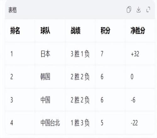 第一名是3勝1負(fù)積7分,凈勝分+32的日本隊(duì);第二名為2勝2負(fù)積6分,凈勝分為0分的韓國隊(duì);第三名為2勝2負(fù)積6分,凈勝分為-6分的中國隊(duì);第四名為1勝3負(fù)積5分,凈勝分為-22的中國臺(tái)北隊(duì)。
