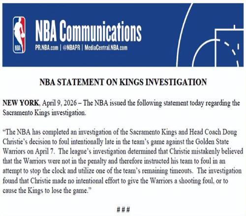 北京時間4月10日,聯(lián)盟在今日的官方聲明中宣布,NBA已結束針對國王隊的簡短調查,不會對球隊處以罰款,也不會采取任...