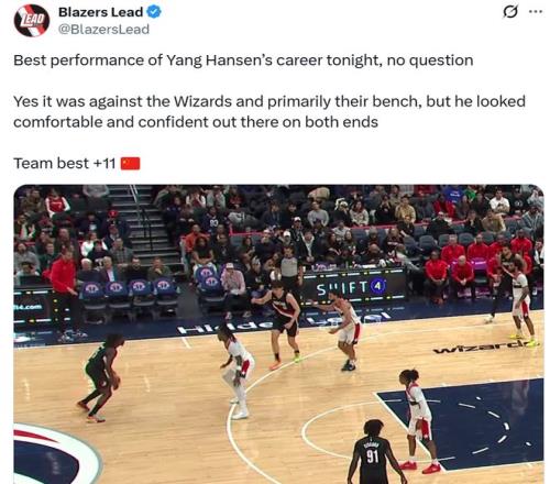賽后開拓者媒體Blazers Lead也發(fā)文稱贊到:“毫無疑問,今晚是楊瀚森生涯最佳表現(xiàn),雖然對(duì)手是奇才,主要對(duì)陣的還是輪換球員,但他在攻防兩端打得游刃有余,信心滿滿,正負(fù)值+11更是全場(chǎng)最佳?!?/p>