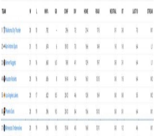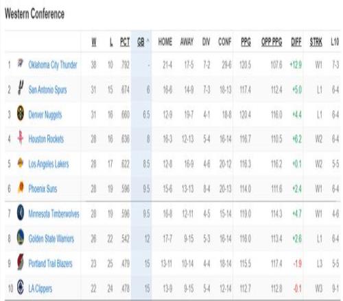 西部前十的排名:雷霆、馬刺、掘金、火箭、湖人、太陽、森林狼、勇士、開拓者、快船。