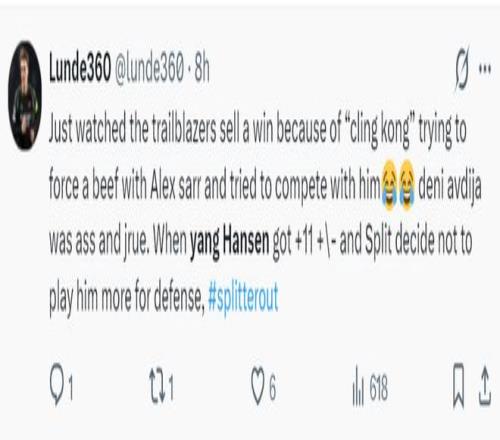 賽后開拓者球迷、開拓者媒體、美國媒體都為楊瀚森此役的表現(xiàn)點(diǎn)贊:克林根與薩爾發(fā)生了一次沖突導(dǎo)致球隊(duì)的勝利溜走,而楊瀚森在場(chǎng)+11明顯更出色,可斯普利特卻不讓他在關(guān)鍵時(shí)刻參與防守。