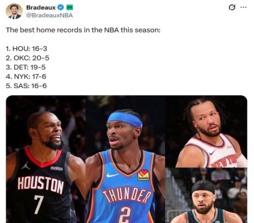 尤其是在主場戰(zhàn)績方面,火箭隊以16勝3負的傲人發(fā)揮力壓20勝5負的雷霆隊高居聯盟第一,東部第一活塞以19勝5負排在聯盟第三,尼克斯17勝6負第四,馬刺16勝6負位列第五。