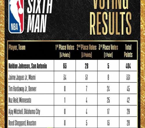 值得一提的是,本賽季常規(guī)賽,約翰遜在替補(bǔ)席上一共拿到了1081分,馬刺隊(duì)隊(duì)史第一。超過了馬刺隊(duì)前最佳第六人、也是隊(duì)史傳奇吉諾比利保持的927分!靠著這樣的穩(wěn)定性和高效性,約翰遜成功拿到了63張第一選票、28張第二選票和5張第三選票,總分404分,毫無爭(zhēng)議的拿到最佳第六人!而除了約翰遜,熱火隊(duì)的小海梅·哈克斯獲得331分,排名第二;掘金隊(duì)的蒂姆·哈達(dá)威獲得了45分排名第三;森林狼的里德獲得42分,排名第四;雷霆隊(duì)的米切爾獲得29分排名第五;火箭隊(duì)的謝潑德,獲得了28分,排名第六。其中謝潑德獲得選票,火箭球迷可能是沒想到的。