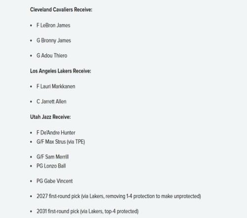 爵士得到:亨特+斯特魯斯+梅里爾+鮑爾+文森特+2027年湖人首輪(取消前四保護(hù),成為無(wú)保護(hù)首輪)+2031年湖人前四保護(hù)首輪。