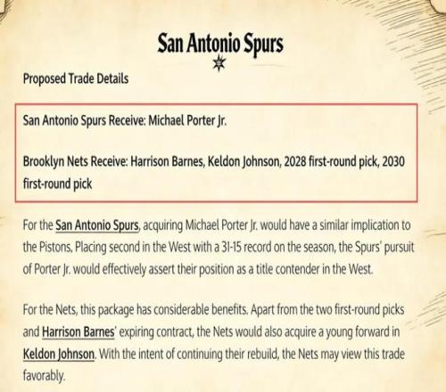 美媒《Fadeaway World》則提出了4換1的交易方案,建議馬刺送出巴恩斯、凱爾登、2028年以及2030年的首輪簽,從籃網(wǎng)引入前鋒小波特。
