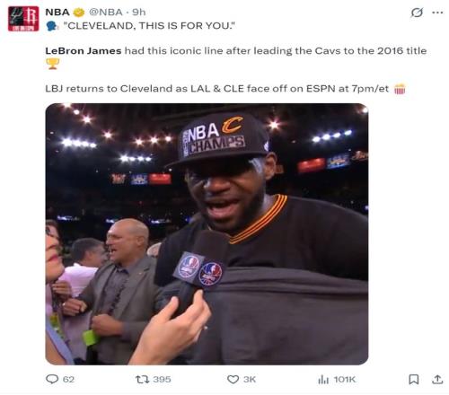 NBA官方也回顧了2016年詹姆斯帶隊奪冠后的言論:克利夫蘭,這是送給你的!