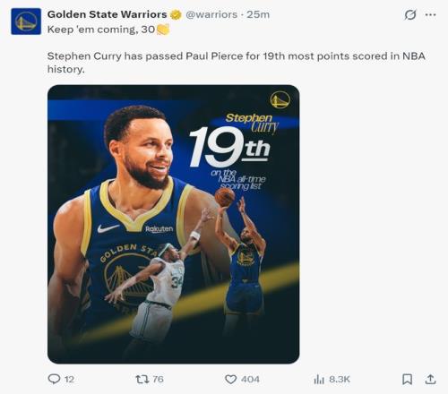 庫(kù)里在nba歷史得分榜上超越保羅-皮爾斯獨(dú)享第19位。