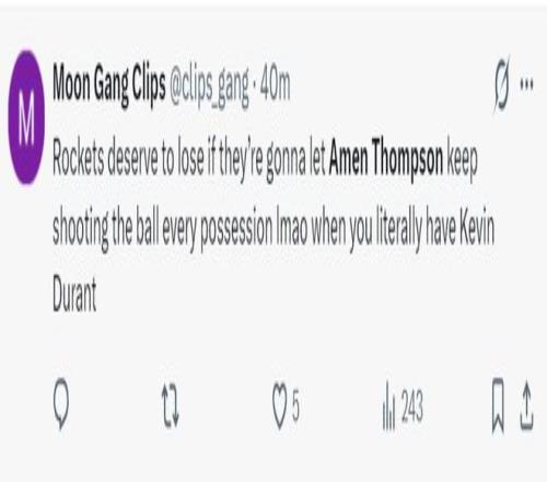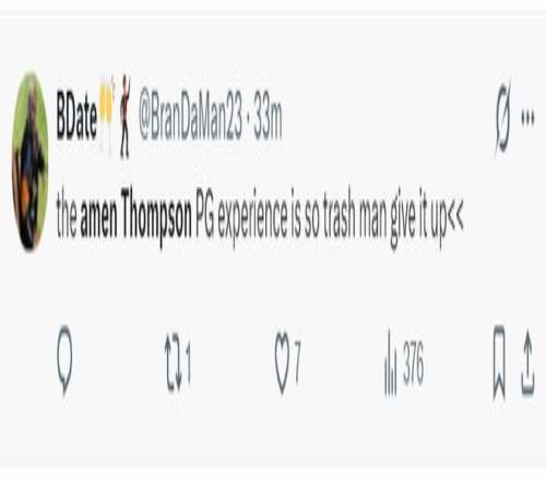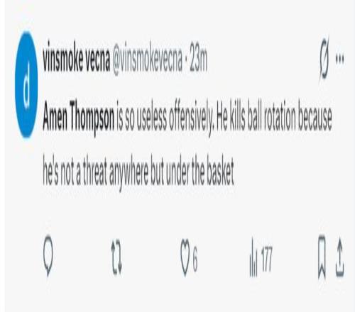 火蜜:阿門(mén)-湯普森在進(jìn)攻方面太沒(méi)用了。他完全破壞了球的運(yùn)轉(zhuǎn)節(jié)奏,因?yàn)樗谇驁?chǎng)上的任何位置都不具備威脅性,只有在籃下才有威脅。