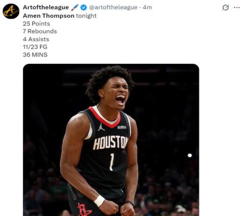 此役阿門(mén)-湯普森全場(chǎng)比賽36分鐘,23中11,罰球3中3,拿到火箭最高的25分外加7分4籃板4搶斷1蓋帽,命中率47.8%,整個(gè)第四節(jié)7中1拿2分,他出手是火箭最多。