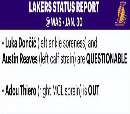 北京時間1月30日,湖人官方更新了明日對陣奇才的傷情。奧斯汀-里夫斯因小腿拉傷缺席了此前的17場比賽,目前狀態(tài)...