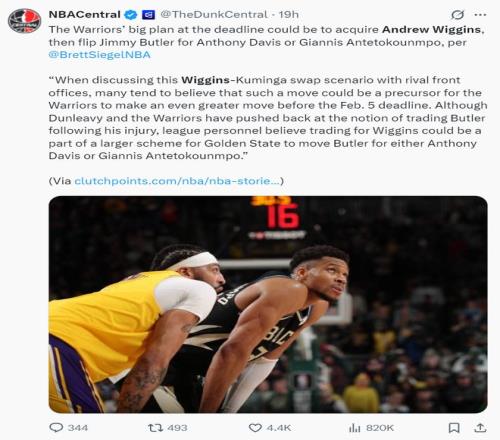 根據(jù)Brett Siegel的報(bào)道,勇士隊(duì)目前正在推行一個(gè)宏大的交易方案,那就是先把奪冠功臣威金斯換回來(lái),然后再用吉米-巴特勒的到期合同去換安東尼-戴維斯/揚(yáng)尼斯-阿德托昆博。