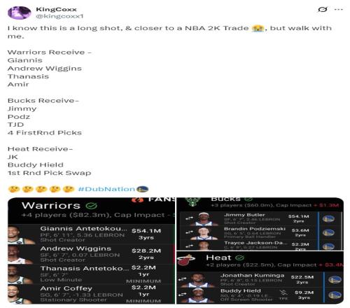 有一位勇士球迷模擬了一套三方大交易方案,這筆交易方案涉及9人,這樣勇士可以一步到位同時(shí)得到威金斯、揚(yáng)尼斯。