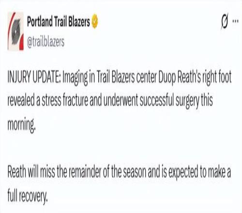 開拓者傷情更新!里斯接受右腳手術(shù)賽季報銷兩大后衛(wèi)接近復(fù)出