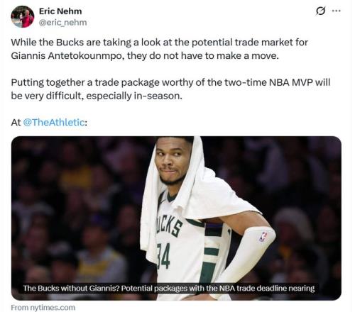 在這種情況下,The Athletic雄鹿隊記Eric Nehm曬出潛在8換2交易方案,具體如下: