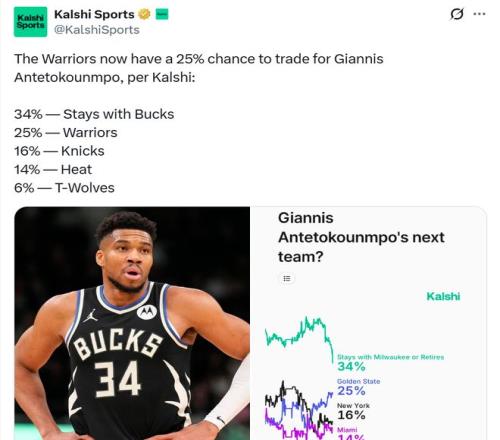 在預測機構(gòu)Kalshi Sports給出的字母哥下家名單中,勇士隊也以25%的可能性高居第二,僅次于留守雄鹿隊的34%,要比尼克斯16%、熱火14%和森林狼6%高出不少。