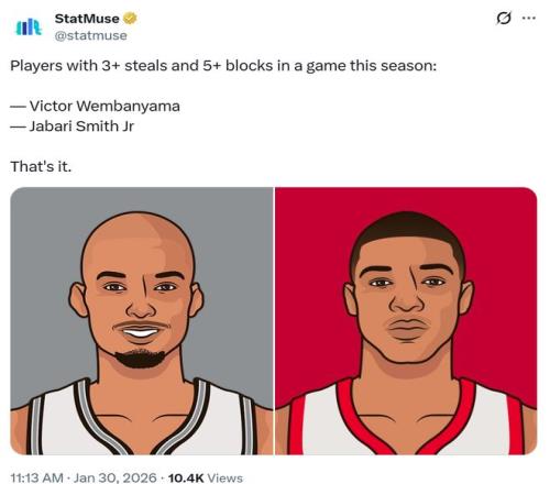 其中小賈巴里史密斯尤為明顯,全場小賈打出攻防俱佳表現(xiàn),12中5,三分6中2拿下14分8板3助3斷5帽全能表現(xiàn),正負值+15首發(fā)第一名,也讓其成為本賽季文班之后,第二位單場送出至少3斷5帽的球員。