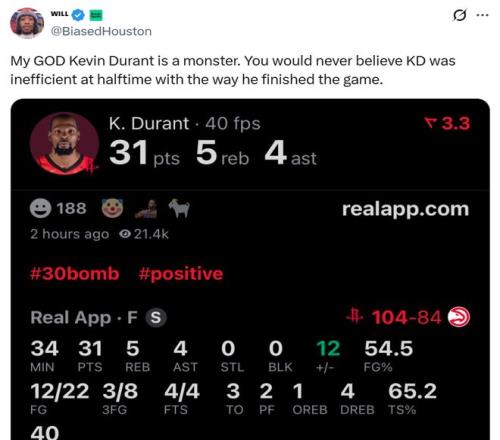 面對杜蘭特這樣的表現(xiàn),火箭媒體人也不禁感嘆道,在上半場狀態(tài)那么低效的情況下,最終杜蘭特還是能夠扭轉(zhuǎn)局面,他真的是個怪物。