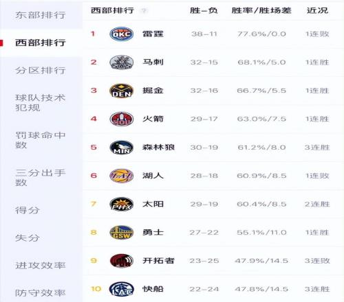 目前西部前十的排名:雷霆、馬刺、掘金、火箭、森林狼、湖人、太陽、勇士、開拓者、快船。