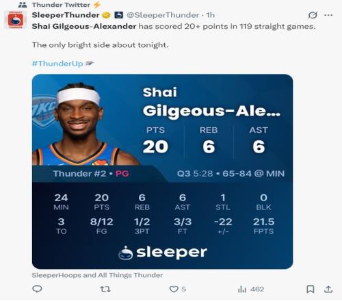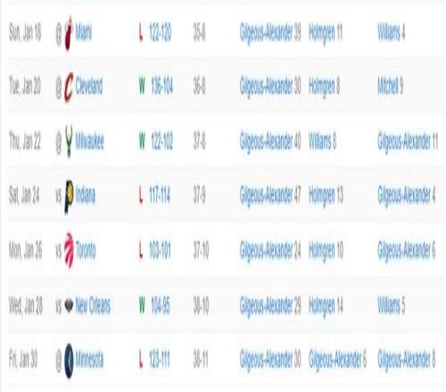 這場(chǎng)比賽SGA延續(xù)了連續(xù)119場(chǎng)20+的紀(jì)錄,他距離張伯倫連續(xù)126場(chǎng)20+的紀(jì)錄只差7場(chǎng),這場(chǎng)比賽SGA真的是被迫背鍋的。
