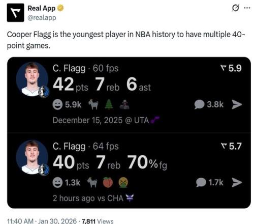 第七項:19歲40天的弗拉格成為史上單場得分45+最年輕的球員。