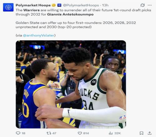 美媒PH透露,勇士隊在報價揚尼斯的過程中最多可以送出四個首輪簽:2026年、2028年、2032年(三個不保護)、2030年(前20順位保護)的首輪簽。