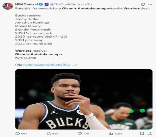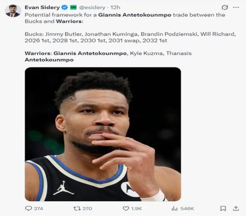 《福布斯體育》記者埃文-斯迪瑞透露,勇士隊除了能送出4個首輪簽外,他們2031年的首輪互換權(quán)也可以用于交易揚尼斯,而如今的難點在于如何配平薪資。