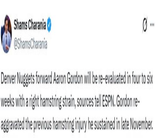 北京時間1月30日,據名記Shams報道,消息源透露,丹佛掘金隊前鋒阿隆-戈登因右腿筋拉傷,將在四至六周后接受傷情復...