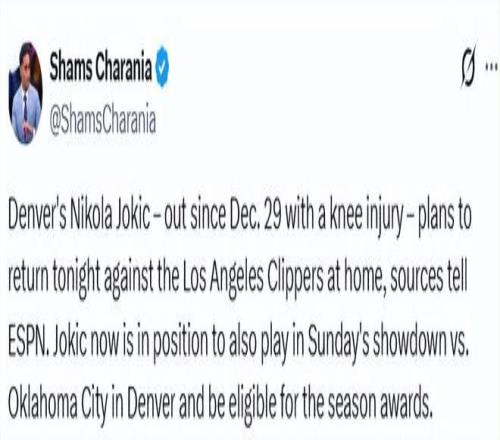 Shams曾在1月中旬表示,掘金隊(duì)對(duì)于約基奇能在當(dāng)月月底前復(fù)出持樂(lè)觀態(tài)度。但在本周三的一檔電視節(jié)目中,他又指出,這位三屆常規(guī)賽MVP得主將在下周接受復(fù)查,為確保其身體狀態(tài)完全恢復(fù),掘金隊(duì)準(zhǔn)備將他的歸隊(duì)時(shí)間比最初預(yù)期再推遲一段時(shí)間。