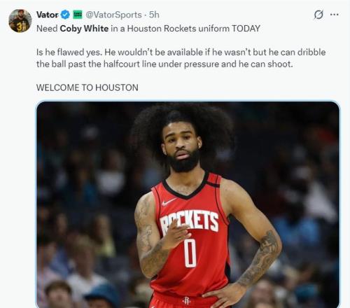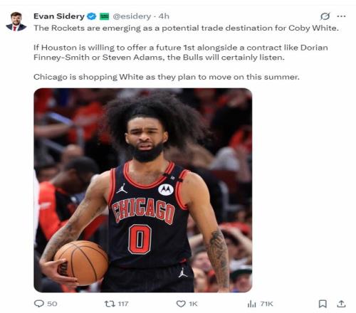 隨后《福布斯體育》記者埃文-斯迪瑞報道,火箭已經(jīng)成為科比-懷特的潛在交易下家,如果火箭隊愿意提供一個首輪簽,再加上芬尼-史密斯或者史蒂文-亞當斯這樣的球員合同,那么公牛會考慮達成交易。