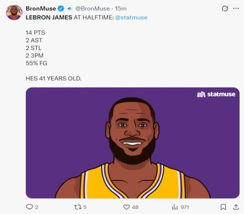 而且勒布朗上半場(chǎng)打了17分鐘,他以55%的命中率拿到14分1籃板2助攻2搶斷2個(gè)三分球,勒布朗打無(wú)球的效率也很高,41歲的老頭子再一次打臉外界的質(zhì)疑。