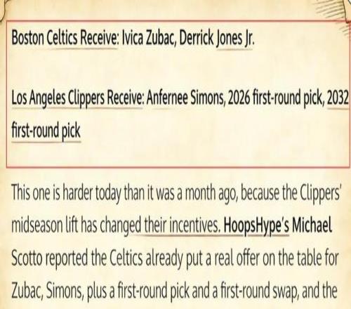 據(jù)悉,洛杉磯快船隊(duì)的祖巴茨,一直是凱爾特人青睞的目標(biāo)之一。知情人士透露,早在一個(gè)月前,凱爾特人便表達(dá)了對祖巴茨的興趣,并提出了小西蒙斯+1個(gè)首輪簽+1個(gè)首輪簽互換權(quán)的報(bào)價(jià),但遭到快船拒絕。