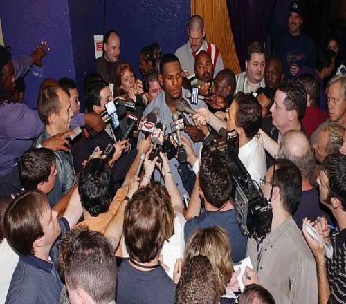 2003年7月8日,NBA夏季聯(lián)賽,騎士107-80戰(zhàn)勝魔術(shù),詹姆斯首次出現(xiàn)在職業(yè)比賽,得到14分7籃板6助攻;2003年10月29日,騎士客場挑戰(zhàn)國王,詹姆斯迎來NBA生涯的第一場正式比賽,最終他得到25分6籃板9助攻。