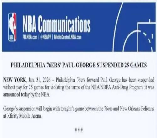 北京時間2月1日,NBA名記Shams報道,76人鋒線球星因違反聯(lián)盟禁藥政策將被聯(lián)盟禁賽25場!隨后,NBA官方對此進行了官...