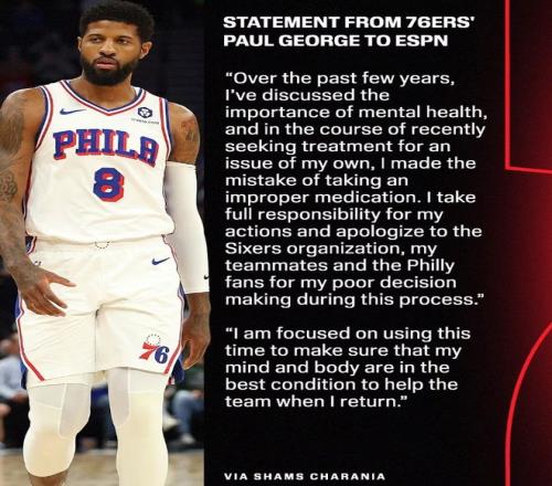 喬治通過ESPN記者Shams Charania發(fā)布了一份個人聲明,解釋自己是在尋求心理健康治療時“犯了錯誤,服用了不合適的藥物”。他對此承擔全部責任,并向球隊、隊友和球迷道歉。