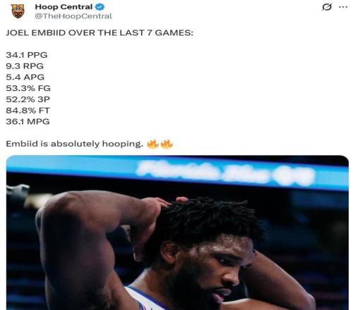 值得一提的是,恩比德本場(chǎng)的表現(xiàn)并非靈光一閃,而是1月份以來(lái)火爆表現(xiàn)的縮影。