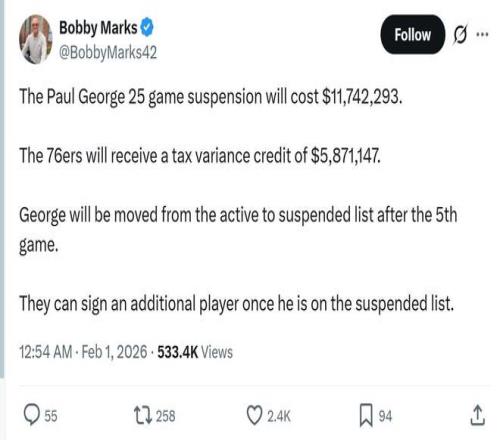 同時(shí)在喬治被禁賽第5場(chǎng)后,他將被轉(zhuǎn)移至禁賽名單,屆時(shí),76人可以額外簽下一名球員填補(bǔ)空缺。