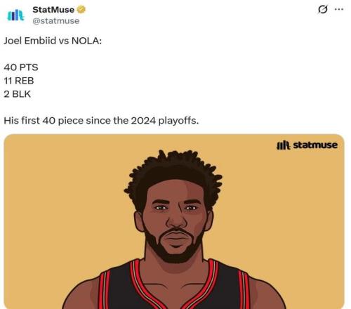 全場(chǎng)恩比德出戰(zhàn)39分鐘,27中13,狂砍賽季新高的40分,外加11板4助1斷2蓋帽全能數(shù)據(jù),正負(fù)值+16全場(chǎng)第一。