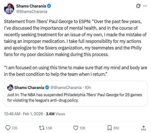 隨后NBA官方發(fā)布公告確認(rèn)消息真實(shí)性,喬治本人也發(fā)布聲明表示自己是在尋求治療自身心理健康問(wèn)題的過(guò)程中,錯(cuò)誤地服用了不合適的藥物。