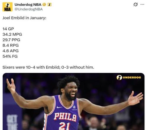 1月份恩比德在出戰(zhàn)的14場(chǎng)比賽中,場(chǎng)均轟下29.7分8.4板4.6助全能表現(xiàn),命中率54%,率隊(duì)拿下10勝4負(fù)戰(zhàn)績(jī),而在其缺席的3場(chǎng)比賽中,76人隊(duì)0勝3負(fù)。