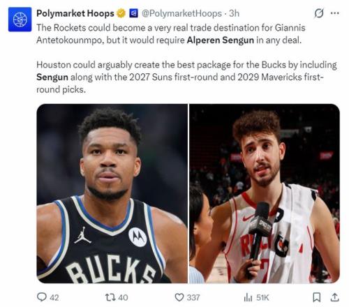北京時(shí)間2月1日,美媒Polymarket Hoops報(bào)道:火箭可能會(huì)成為揚(yáng)尼斯-阿德托昆博的潛在交易下家,但任何交易中都必須包含阿爾佩倫-申京才行,從某種角度來看,火箭納入申京、2027年太陽首輪、2029年獨(dú)行俠首輪簽,這樣足以滿足雄鹿隊(duì)的需求。
