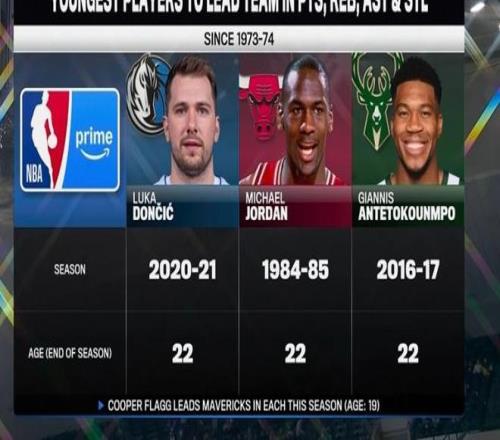 需要關(guān)注的是,歷史上最年輕的得分、籃板、助攻、搶斷均領(lǐng)銜全隊(duì)的球員,分別有20-21賽季,22歲的東契奇;84-85賽季,22歲的邁克爾喬丹,16-17賽季,22歲的字母哥。本賽季弗拉格得分籃板助攻搶斷也領(lǐng)銜全隊(duì),而弗拉格僅僅只有19歲。