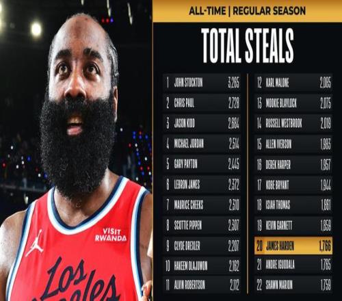需要關(guān)注的是,當(dāng)對手在末節(jié)轟出19比7的攻勢將分差縮小至2分之際,哈登命中了遠(yuǎn)投幫助快船穩(wěn)住了局面。值得一提的是,哈登還在此役創(chuàng)下了紀(jì)錄。此役之后,哈登已經(jīng)拿到生涯第1766個搶斷。哈登生涯搶斷數(shù)正式超越伊戈達(dá)拉,升至NBA歷史搶斷榜第20位,下一個追逐名宿凱文加內(nèi)特(1859)。