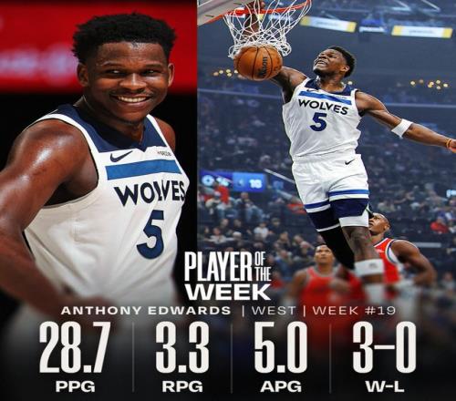 過去一周,愛德華茲率領(lǐng)森林狼取得3勝0負(fù)的戰(zhàn)績,場均28.7分3.3籃板5.0助攻。